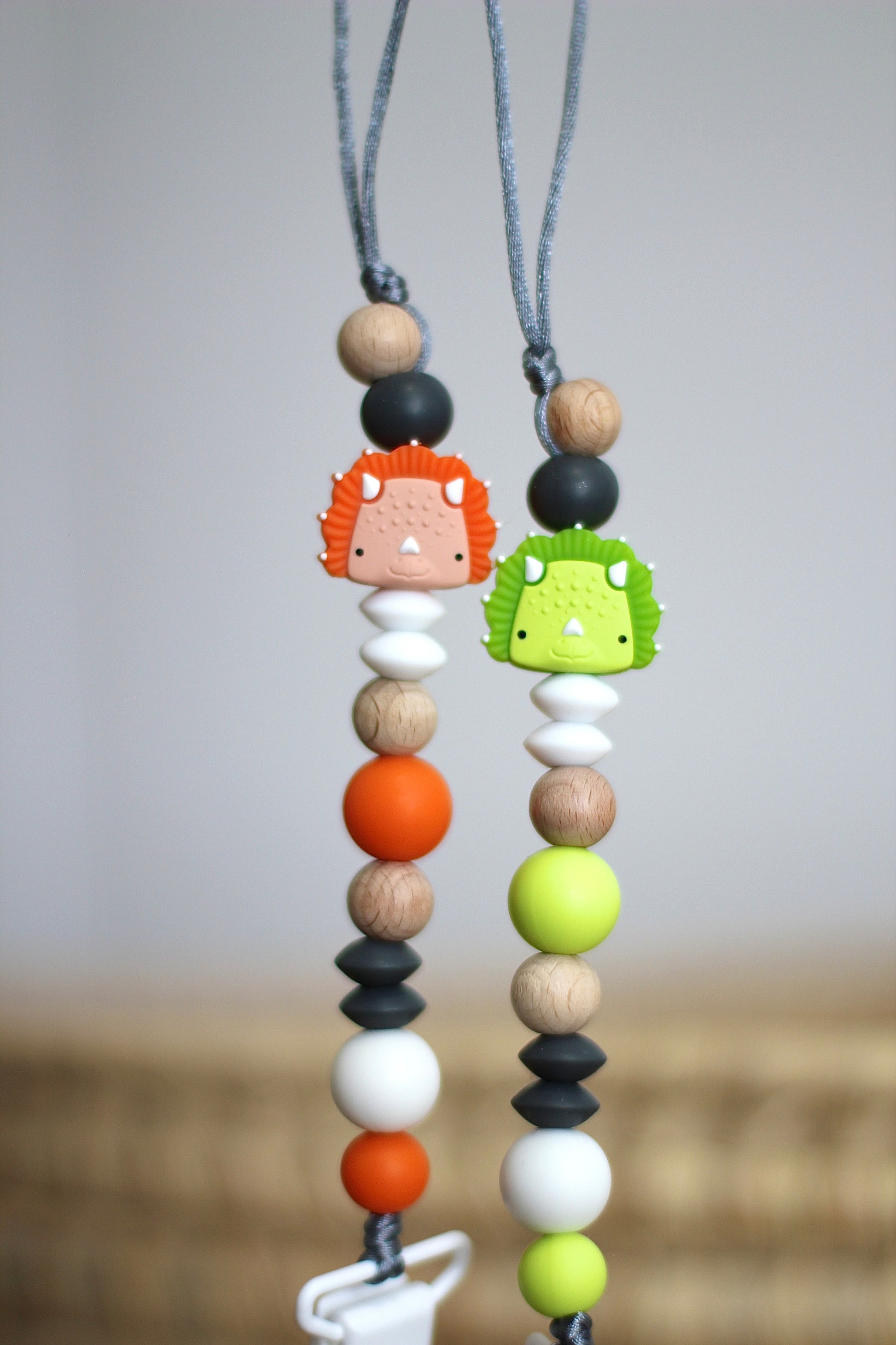 Découvrez nos attaches-suce aux couleurs vives, avec leurs adorables tricératops, non seulement elles ajoutent une touche de style à la tenue de bébé, mais elles offrent également une solution pratique pour éviter les suces perdues.